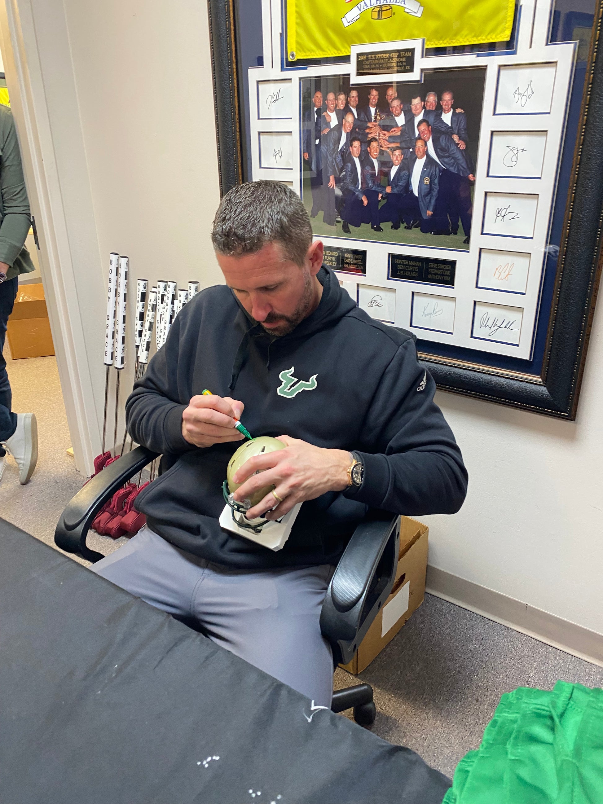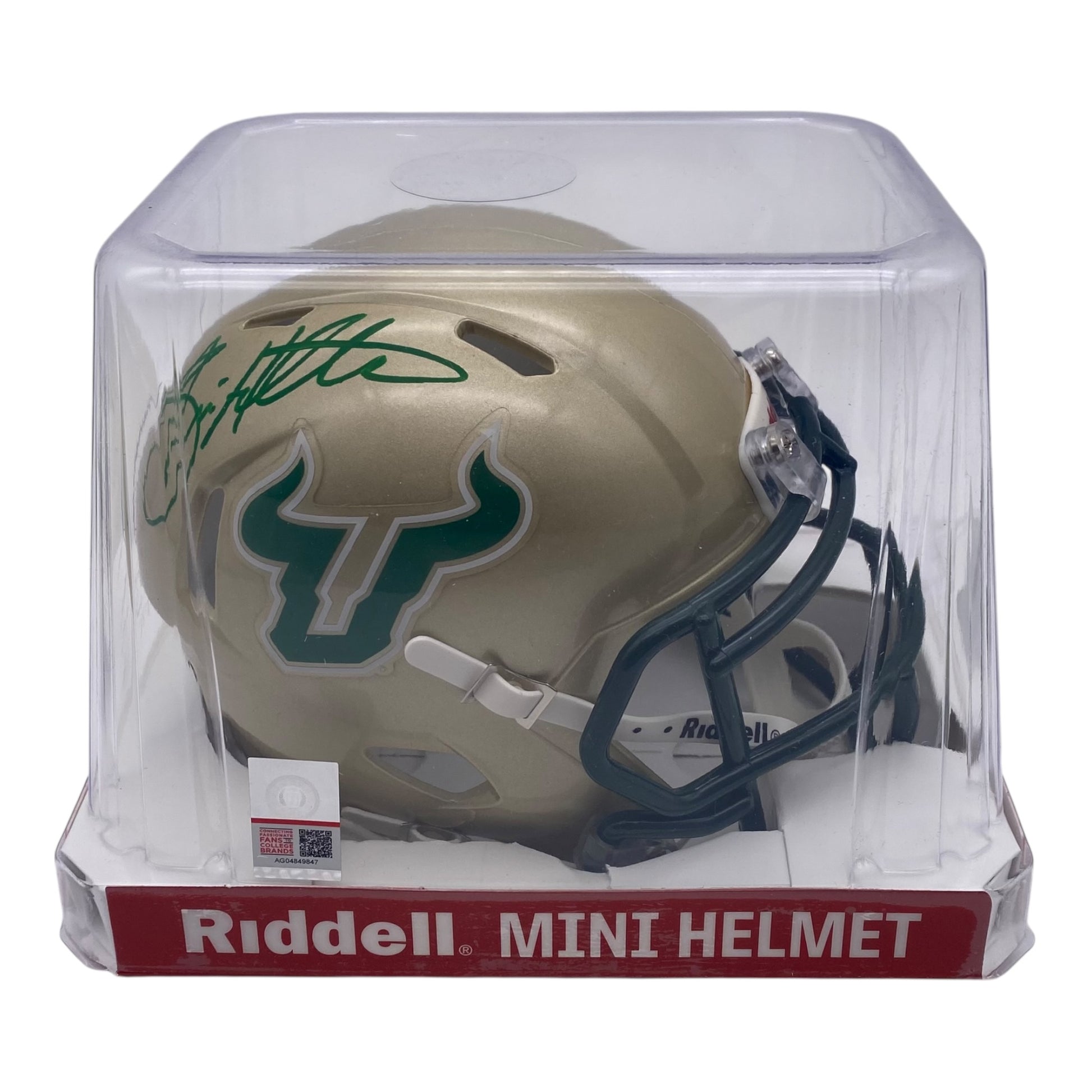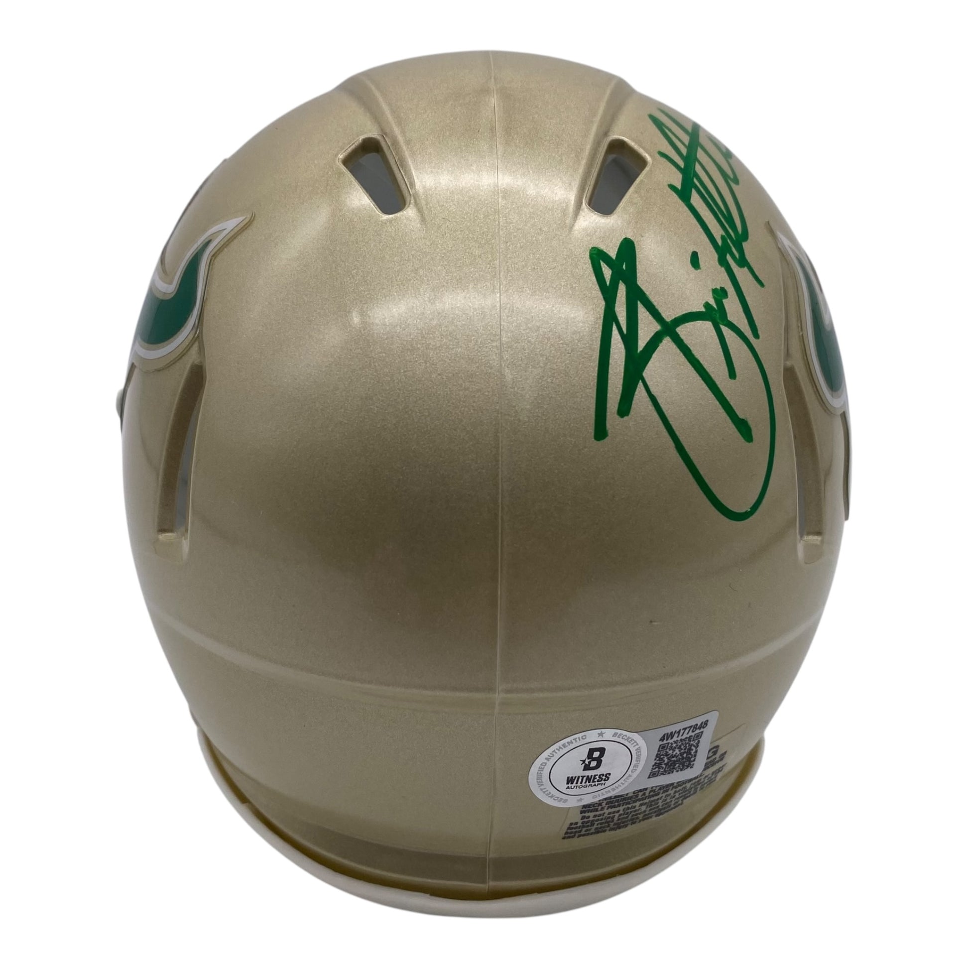 Own a piece of college football history with this Brian Hartline signed University of South Florida USF Bulls gold speed mini helmet. Authenticated by Beckett Witness certification and freshly signed on February 4, 2026, this collectible captures the legacy of one of USF's most anticipated Coaches. The striking gold finish showcases the Bulls' iconic branding, making it an eye-catching display piece for any memorabilia collection. Perfect for devoted USF fans, Hartline enthusiasts, or serious collectors seeking authenticated sports memorabilia with documented provenance.