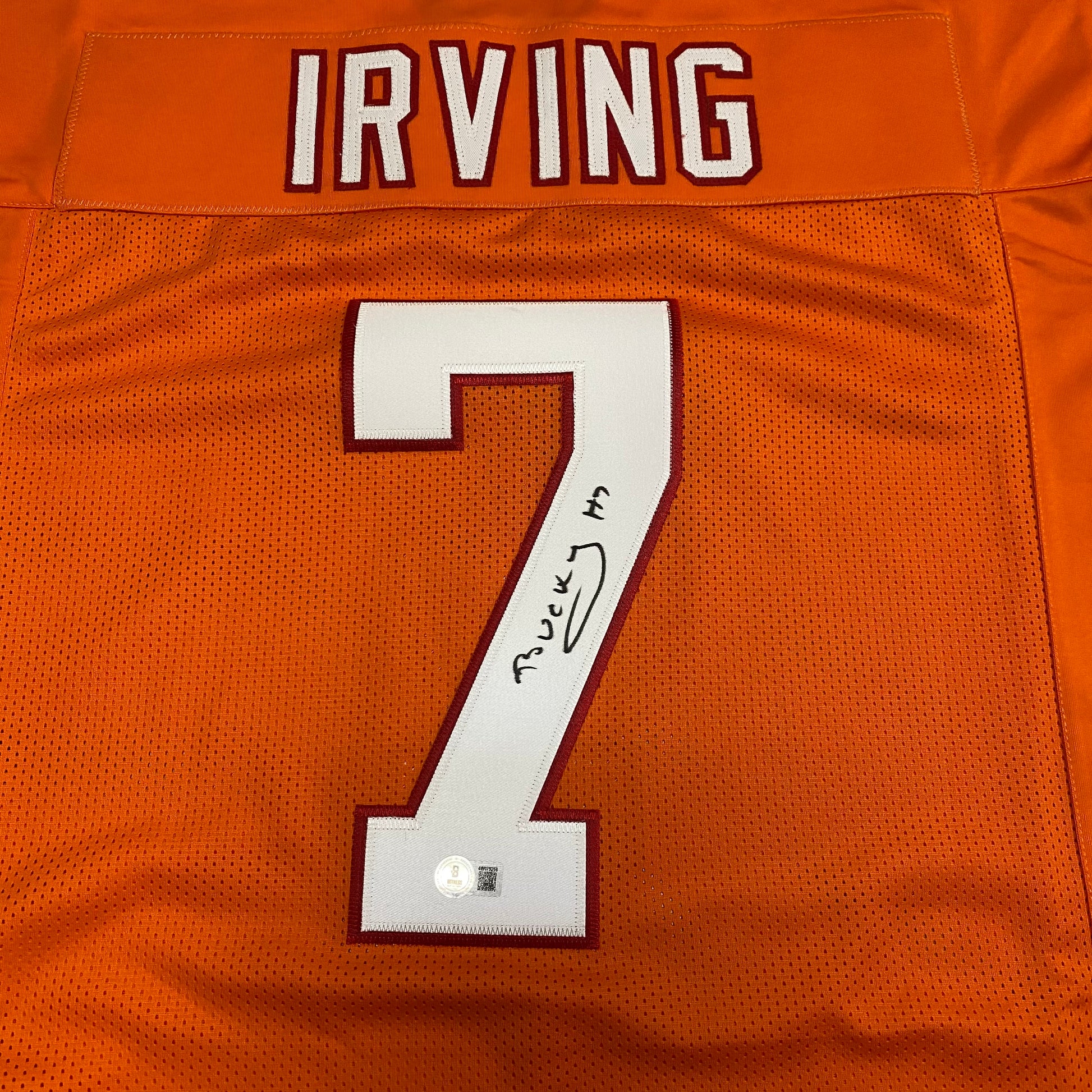 Elevate your fan gear with this Orange #7 stitched jersey signed by super star running back Bucky Irving. Certified by Beckett, this jersey is a must-have for any die-hard Buccaneers fan. Show your support and add a touch of flare to your collection.