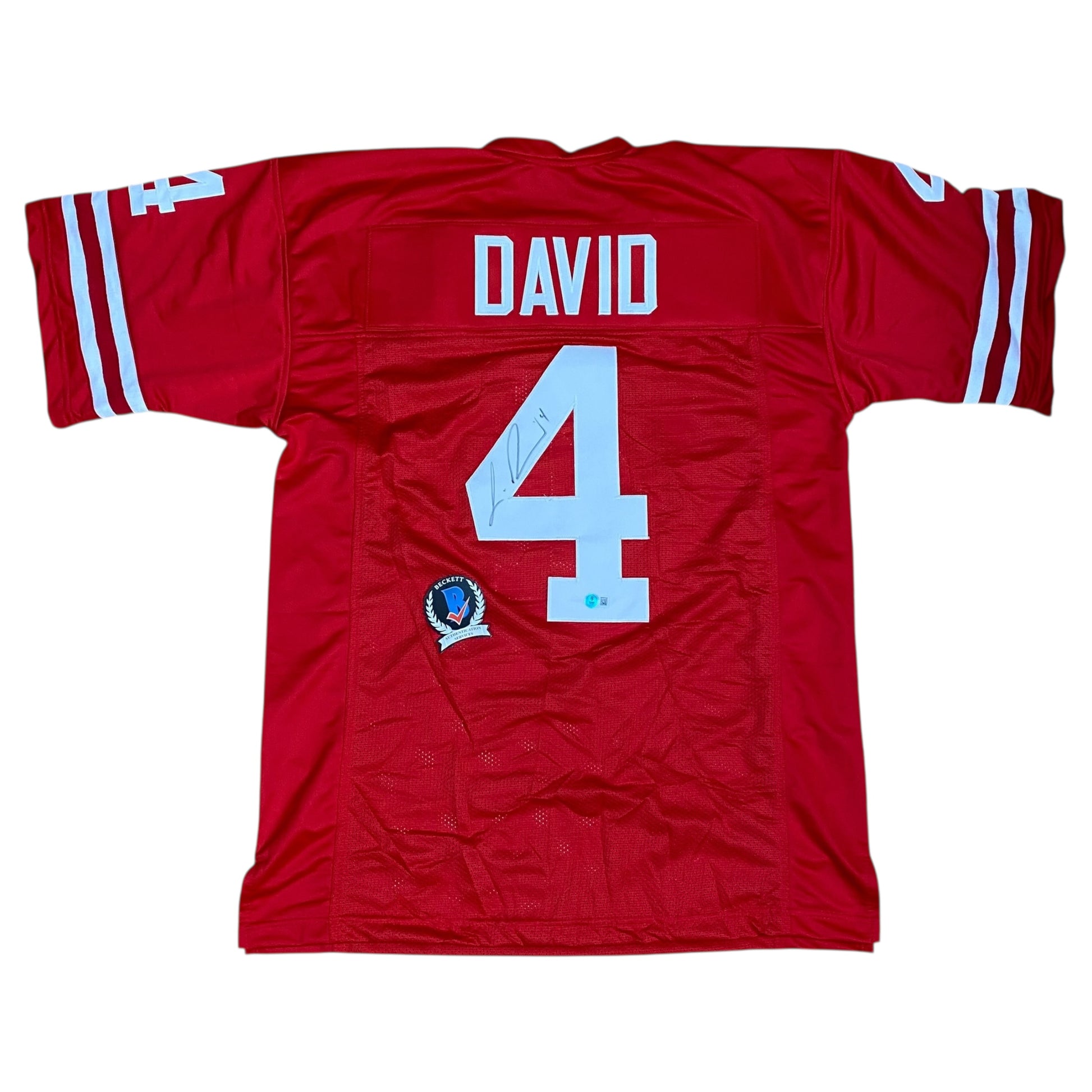 Celebrate college football excellence with this Lavonte David signed jersey. Displaying his #4 in the iconic Huskers red, this premium stitched jersey honors his standout collegiate career that launched him to NFL stardom. Beckett Certification authenticates the signature, guaranteeing you're acquiring genuine memorabilia backed by industry-leading verification. Ideal for Nebraska alumni, devoted Cornhuskers fans, and collectors who appreciate the roots of greatness. This certified piece captures a pivotal chapter in David's journey to becoming a defensive legend. Add it to your collection today.
