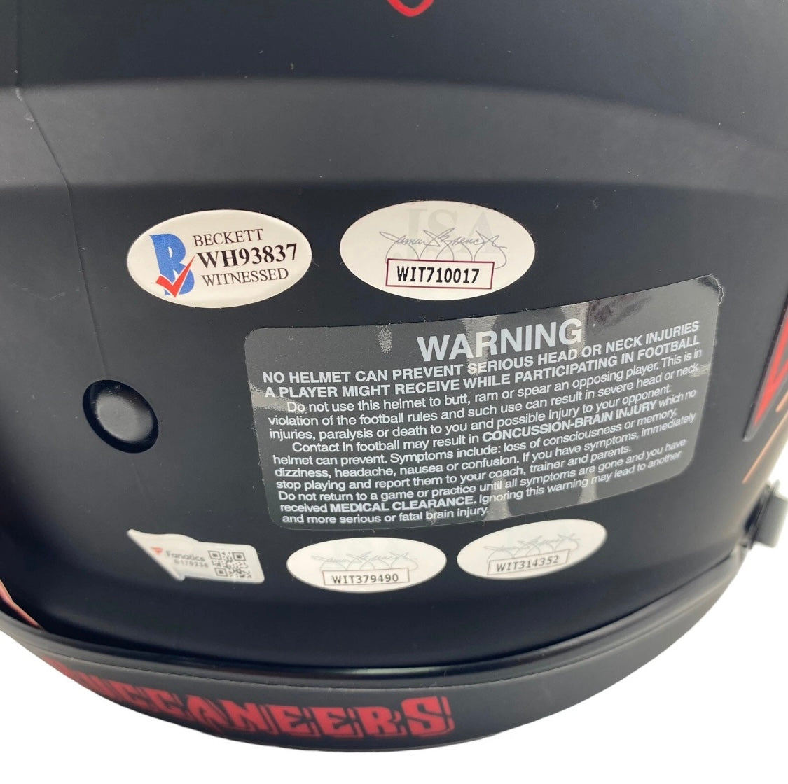 Own a piece of history with this Tampa Bay Buccaneers Super Bowl 55 Champs Team Signed Eclipse Full Size Authentic Football Helmet. This helmet features the authentic signatures of Mike Evans, Rob Gronkowski, Antoine Winfield Jr., Chris Godwin, Leonard Fournette, Ronald Jones, Tyler Johnson, Lavonte David, Shaq Barrett, Carlton Davis, Jamel Dean, Jason Pierre Paul, Antonio Brown, Devin White, Mike Edwards, Vita Vea, Jordan Whitehead. With Fanatics, Beckett Authentication Services (BAS), and JSA certification, this original and authentic helmet is perfect for any Bucs fan. Display it proudly in your home or office as a symbol of your support for the team. |